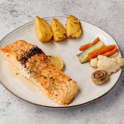 Filet de saumon à l'huile d'olive et herbes, pomme de terre et légumes